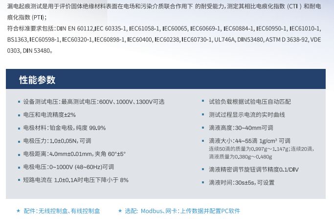 漏電起痕測試是用于評價固體絕緣材料表面在電場和污染介質(zhì)聯(lián)合作用下